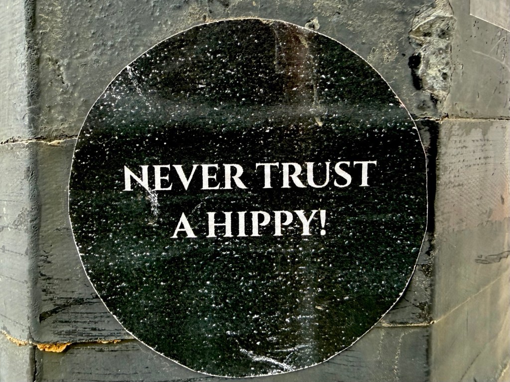A sign reads: Needs Not Met Here — Inquire Without Inquiry. The Unexamined Life is Go Go Go Go!
