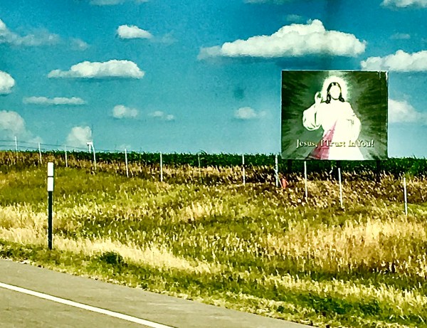 How would she make it through the rest of this desolate and unchanging landscape? She looked up, and there to the right of her car was yet another Jesus accepting her trust — it was turning out to be a challenging morning.