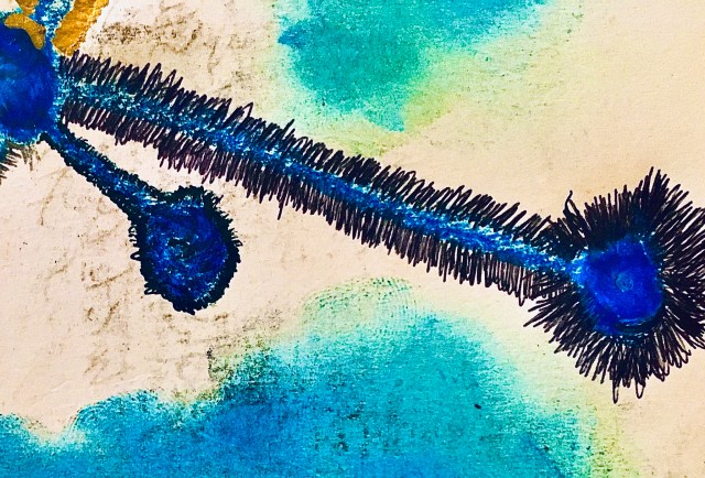 As in the case of a fountain — a girandole — the water radiates out from a central point… or a fulminating firework, but all I can muster is “that incendiary hair — metastasizing through mushroom cloud air. It’s not a visual I want to see but it continually impinges upon my consciousness.”
