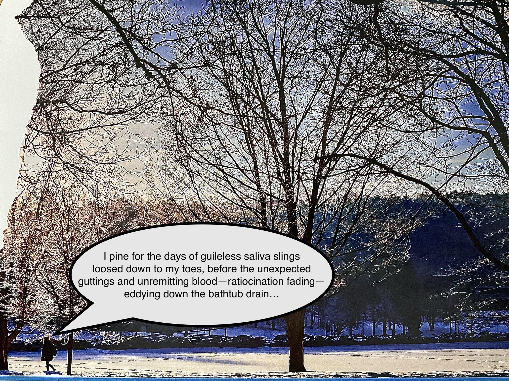 I pine for the days of guileless saliva slings loosed down to my toes, before the unexpected guttings and unremitting blood—ratiocination fading—eddying down the bathtub drain…