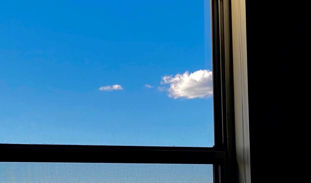 “He has left his shaving brush on top of the cabinet with doors of glass that is merging with a cloud