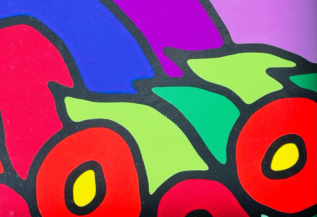 Traffic outside. Snow and garish colors swirl.
