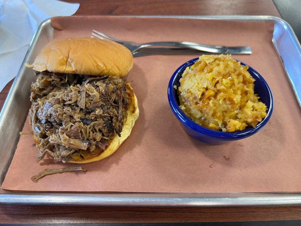 And apropos of nothing… a gratuitous picture of lunch: bbq brisket sandwich and cornbread casserole.