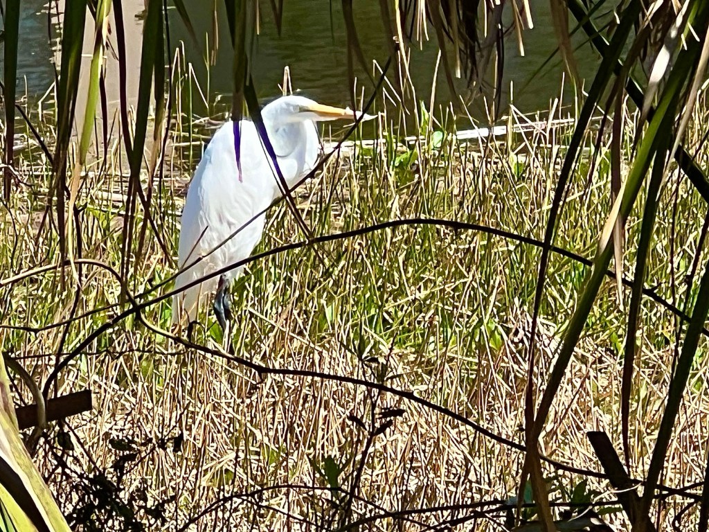 Beyond the bike and picnic table: a Great Egret.