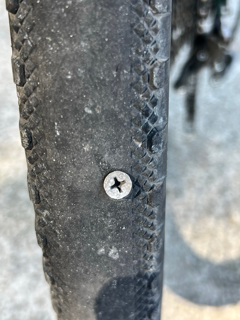 This god-forsaken 1/32nd of an inch, demon’s bicuspid, of a shard was deflating my tire overnight since Richmond Hill, GA four days ago. Each morning I’d have to reinflate my tire to 50 psi from 7-17 psi. It was driving me mad.
