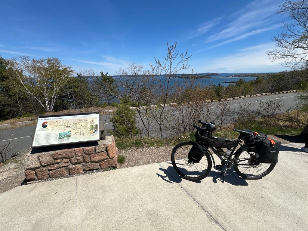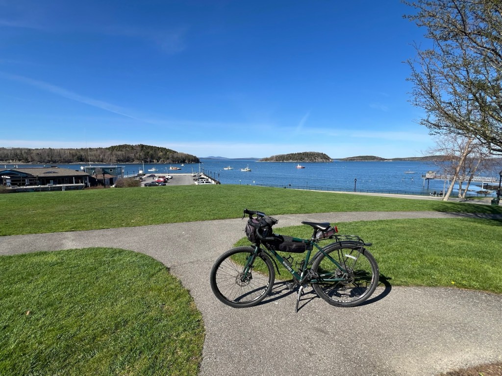 … yes, lucky you, to see it on your bike this way—look it’s Bar Harbor at the far side of Frenchman’s Bay…